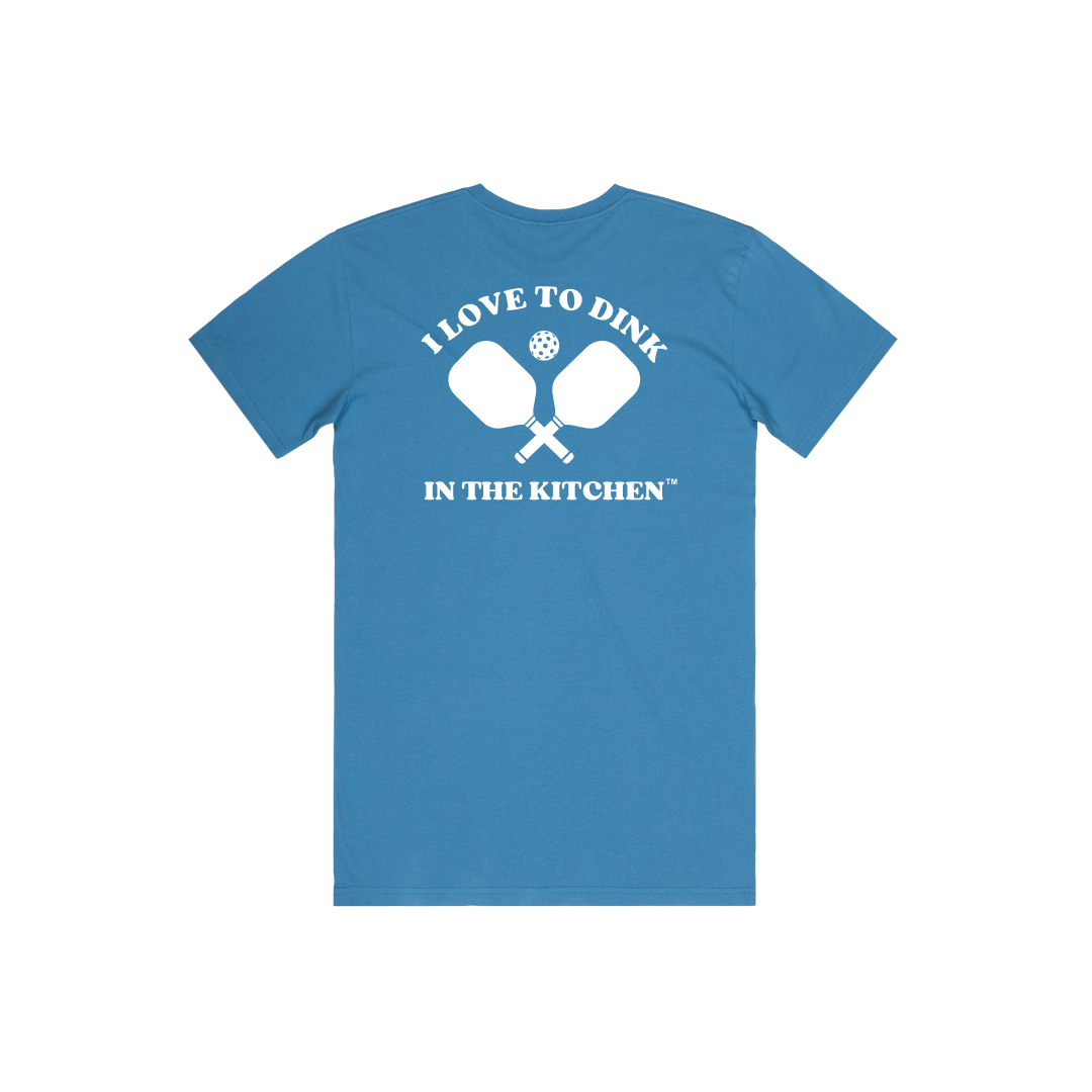 - Bold Graphics: The front boasts a large Love Pickle logo across the chest, while the back features the playful statement "I like to Dink in the Kitchen," making it a conversation starter at any casual or pickleball gathering.